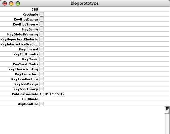 In the prototype for the blog posts, I make it visible. I have chosen (a tip from Adrian) to make one boolean attribute for each index. Of course, I could have had just one "keywords" attribute, but then I would have to remember the exact spelling of all keywords. This way, I just tick off the appropriate keywords for each note.