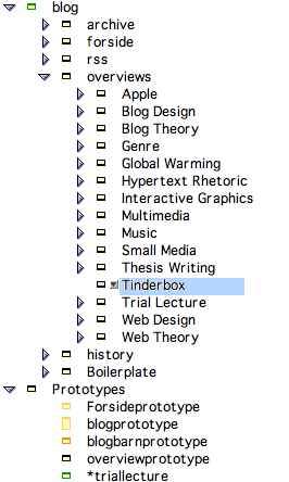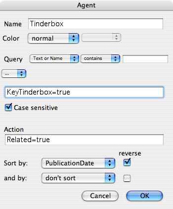 The agent collects all the notes in which "KeyTinderbox" is "true." (Finer point: It also has an action: it sets an attribute called "related" to "true." If a blog post is included in an index, "related" is "true," otherwise it is "false." When exporting blog posts to HTML, the headline "Related overviews" is only inserted if the post is listed in an index and "related" is true.)